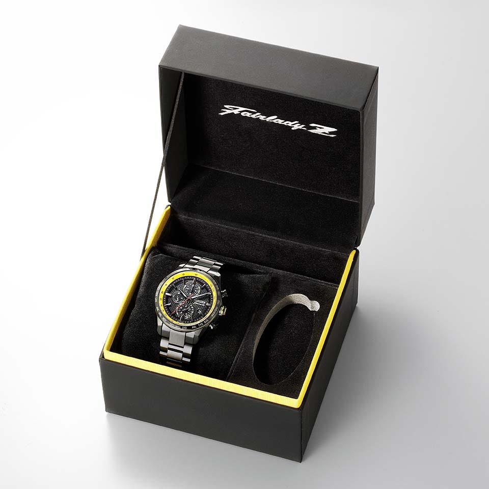 新型フェアレディZイメージカラーの一つである、新色“イカズチイエロー”が映えるデザインのAT8185-89E。文字板のドットパターンは、特別仕様車のシートをイメージ。インデックスまでブラックアウトすることで高級感を演出し、イカズチイエローとドットパターンの印象を際立たせています。