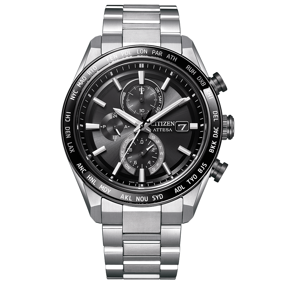 モノトーンでまとめたカラーリングで視認性を確保しました。ベゼルはGPS搭載モデルで人気のサファイアガラスリングを搭載した高級仕様で、サファイアベゼルの上にシルバー蒸着で仕上げた都市名表示が輝きます。