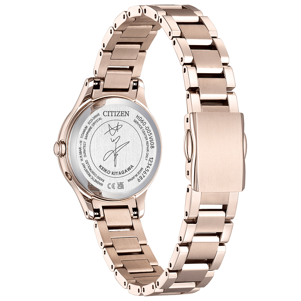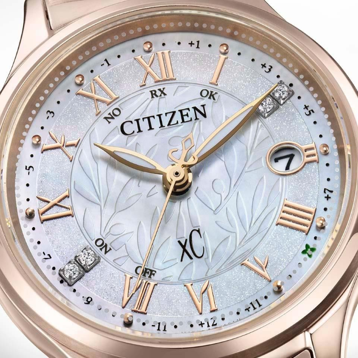 「安らぎ・平和・知恵」などの花言葉を持つ“オリーブ”をモチーフに、クリーンで艶やかな白蝶貝の文字板に、立体感のあるオリーブの葉と実をエッチングパターンで描きました。外周には、上品にきらめくラメを施しています。また、北川景子さんの誕生日(8月22日)にちなんで、8時と2時の位置に合計4ポイントのラボグロウン・ダイヤモンドをセッティング。さらに、22分の位置にはオリーブの花のモチーフをワンポイントとして添え、遊び心を感じさせるこだわりのデザインです。