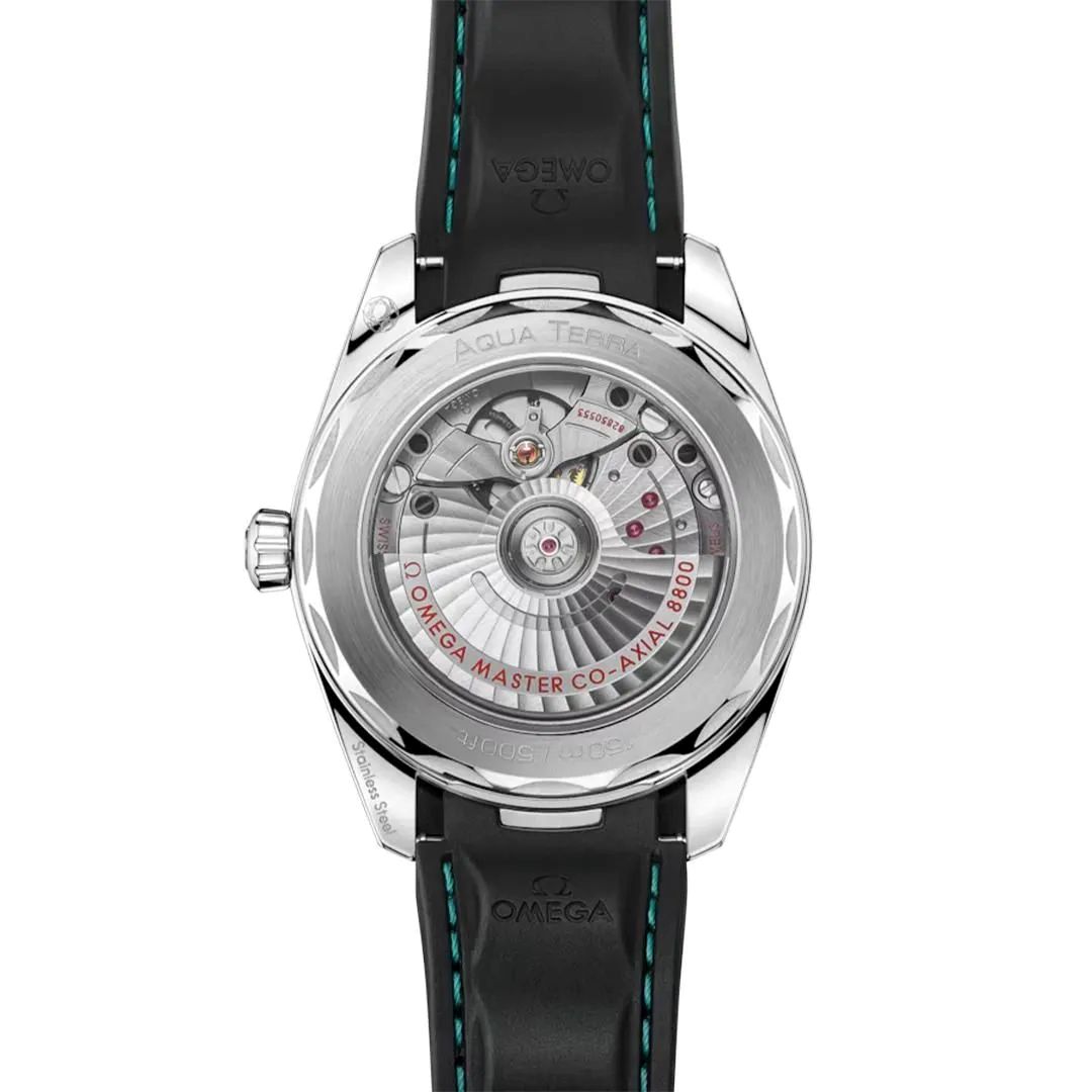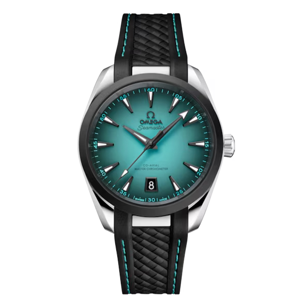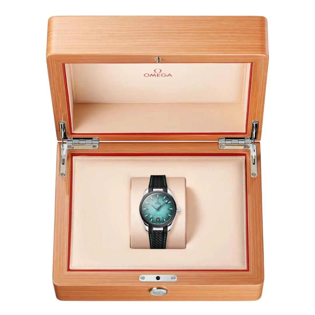 ターコイズのステッチがあしらわれたフォールディングクラスプ付き一体型ブラックラバーストラップが合わせられ、着け心地のよさを約束します。スイス連邦計量・認定局(METAS)認定の業界最高水準を誇るオメガ コーアクシャルマスター クロノメーター キャリバー8800搭載。