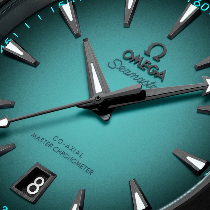 海をインスピレーションにした魅惑的な色彩を奏でるラッカー仕上げのターコイズダイアルには、ブラックのグラデーションが施され、面取りされた針とインデックスはグレーのPVD加工とホワイトのスーパールミノヴァで仕上げられています。同じくグレーのPVD加工が施されたオメガのロゴと日付窓がグレーの転写文字とマッチし、外周のターコイズカラーのミニッツトラックとハーモニーを奏でています。