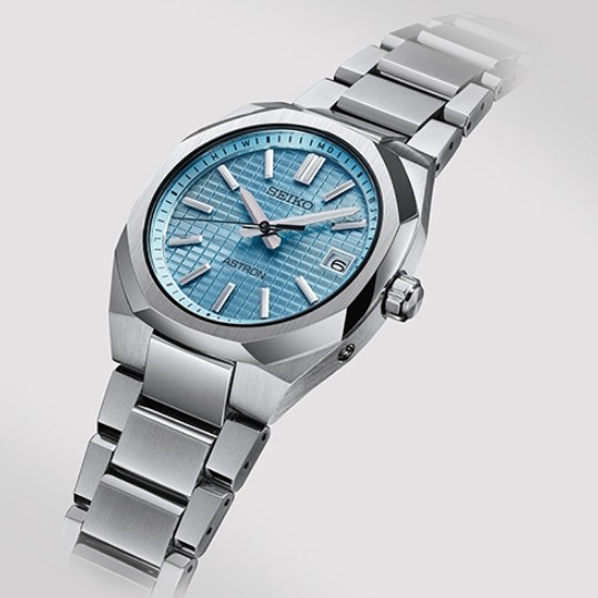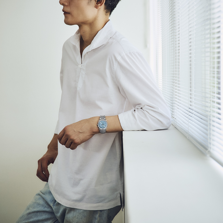 多面カットを施したインデックスと三面カットの時分針、爽やかでトレンド感のあるミントブルーダイヤルには緻密なクリスタルボックスパターンを採用することで、コンパクトサイズならではの高級感のあるデザインを実現。