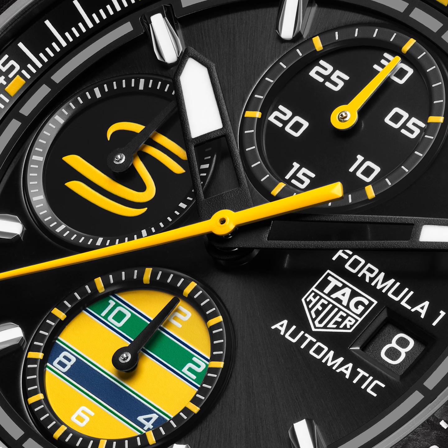 タグ・ホイヤーの最もアイコニックなパートナーシップのひとつを称える、タグ・ホイヤー フォーミュラ1 クロノグラフ × セナ 44mm。アイルトン・セナの、大胆で恐れを知らない、モーターレーシングの卓越性と情熱を追求する精神を捉え、唯一無二のデザインと、DLCコーティングを施したチタンやフォージドカーボン製ベゼルをはじめとした上質な素材で表現する、堂々としたタイムピースです。