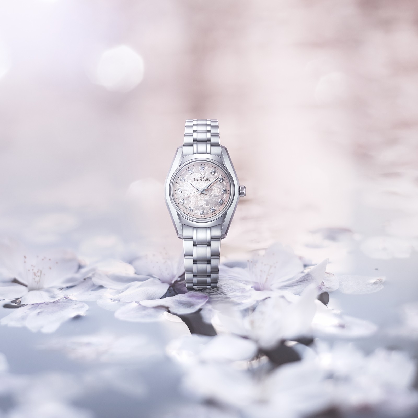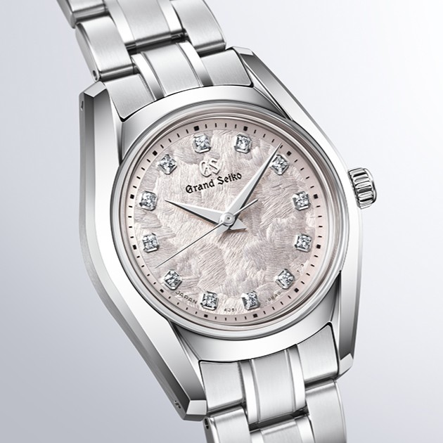 「62GS」の中でも高い支持を得ている「花筏(はないかだ)」に、26mmスモールサイズのクオーツモデルが加わりました。1967年発売のグランドセイコー史上初の自動巻機械式モデル「62GS」を現代的にアレンジした「62GS現代デザインモデル」をベースとし、日本特有の季節の移ろいをダイヤルで表現したモデルです。ベゼル(ガラス縁)のない構造によって広々と見えるダイヤルや、ザラツ研磨によって実現したシャープな多面体からなるケースが魅力です。ダイヤルは、風に舞い散った桜の花びらが川の水面を覆う「花筏」の情景を表現しています。ケースデザインは、小さいながらも高い視認性を確保。シンメトリーに配したダイヤモンドが生み出す、華やかで心地よいダイヤルに仕上げました。ムーブメントは、年差±10秒のクオーツ「キャリバー4J51」を採用しています。