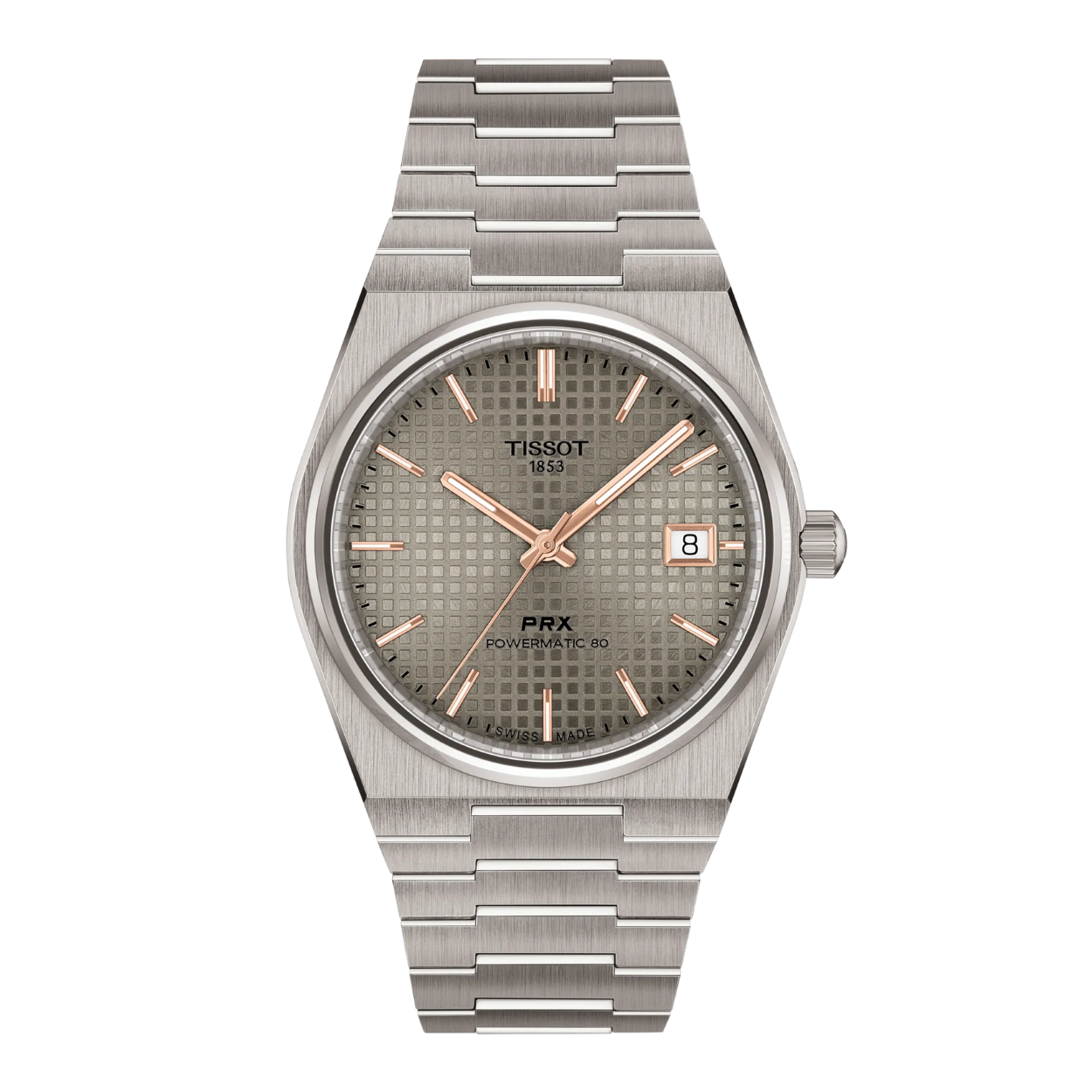 ケースと一体型ブレスレットにチタニウムを採用した2モデルは、羽のように軽さと卓越した強度が特徴です。柔軟性に富み、重みを感じることなく、快適に手首にフィットするこのモデルは、あらゆる冒険のお供に最適です。ディープブルーにニッケル仕上げのバトン針とアプライドインデックスを組み合わせたモデルと、チタンそのものに敬意を表したグレー文字盤に、対照的なローズゴールドの針とインデックスが、洗練された現代的なエッジを放つモデル。2つの異なる文字盤のバリエーションが、独自のキャラクターを表現します。どちらもPRXパワーマティック 80の象徴的な要素である、ワッフル柄の文字盤を備え、時計の大胆でモダンなスピリットを強調すると同時に、完璧な視認性を確保しています。