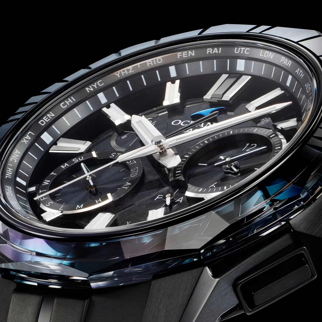 月の光に照らされた夜の海を、DLC処理したチタン外装と江戸切子のサファイアガラスベゼルで表現しました。