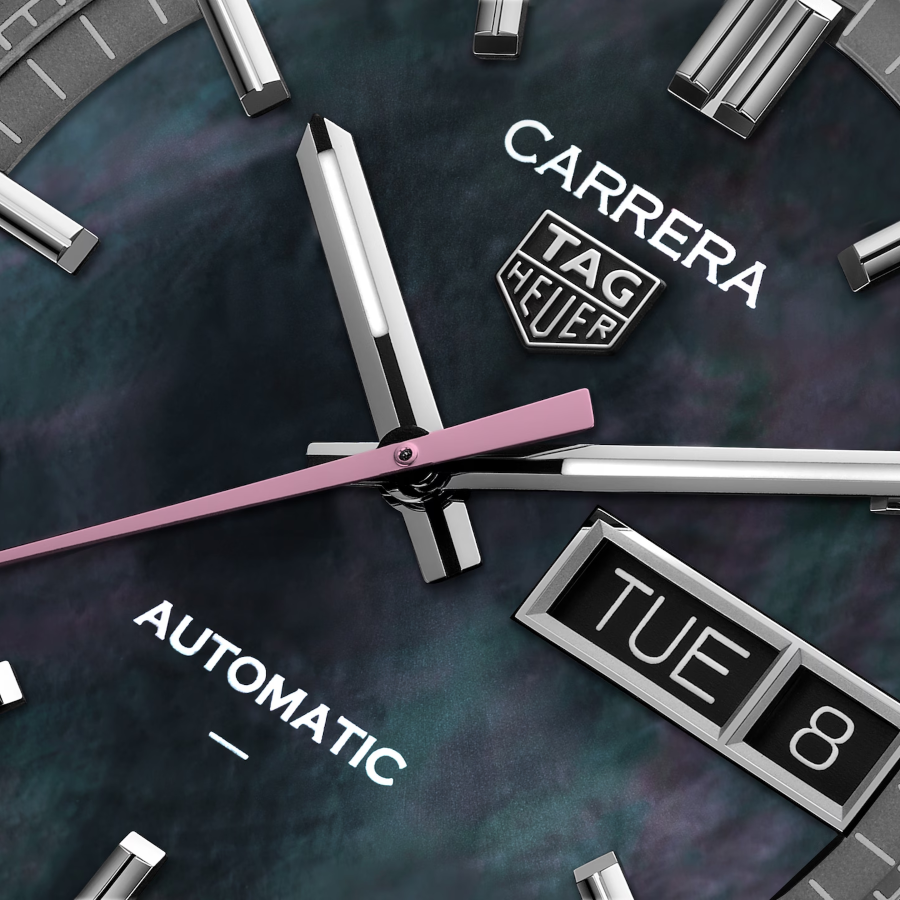 桜から着想を得た日本限定モデル タグ・ホイヤー カレラ デイデイト ジャパン リミテッドエディション。ブラックマザーオブパール(黒蝶貝) のダイヤルは光の加減や見る角度によって幻想的な輝きを放ち、ピンクの秒針をポイントとしてあしらっています。41mmと36mmの2サイズで展開している2つのモデルはペアウォッチとしてお使いいただくのもおすすめです。41mmモデルは200本のリミテッドエディションです。