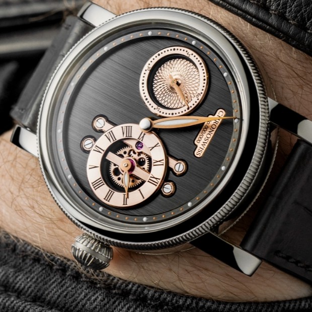 ラグジュアリーと洗練の融合。クロノスイス・ストライク・ツー ゴールデンギアは、エレガントな40mmステンレススティール製ケースに収められています。ダークグレーの文字盤に映えるゴールドのアクセントが、ラグジュアリーを再定義。2つの垂直ブリッジの下に露出した歯車は、自社開発新ムーブメントC.6000を搭載しています。
