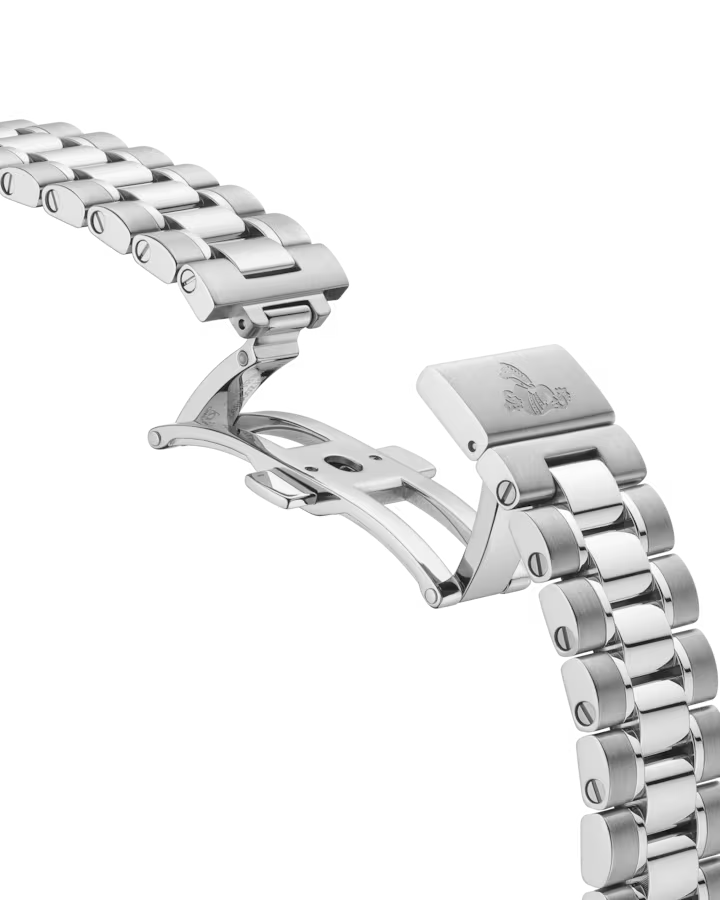 オパーリンシルバーのダイアルには横楕円型のサブダイアルを、6時位置には縦楕円型の日付窓を配しました。インデックスは18Kセドナ™ゴールド製で、針は18Kセドナ™ゴールドとグレーカラーの組み合わせです。