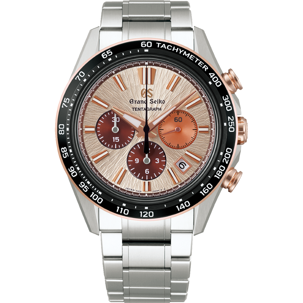 グランドセイコーの真髄と日本の美意識を高い次元で融合させた独自のデザイン文法「エボリューション9スタイル」をベースにしたメカニカルクロノグラフ。グランドセイコーの機械式時計の製造元「グランドセイコースタジオ 雫石」から望む、岩手山から着想を得た型打ち模様を採用し、カッパーピンクを基調とするカラーリングで朝の陽光に輝く堂々たる姿を表現しました。