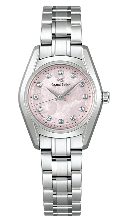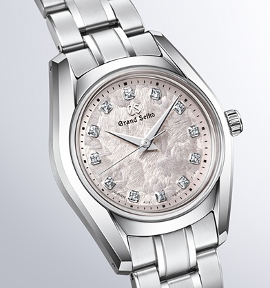 「62GS」の中でも高い支持を得ている「花筏(はないかだ)」に、26mmスモールサイズのクオーツモデルが加わりました。1967年発売のグランドセイコー史上初の自動巻機械式モデル「62GS」を現代的にアレンジした「62GS現代デザインモデル」をベースとし、日本特有の季節の移ろいをダイヤルで表現したモデルです。ベゼル(ガラス縁)のない構造によって広々と見えるダイヤルや、ザラツ研磨によって実現したシャープな多面体からなるケースが魅力です。ダイヤルは、風に舞い散った桜の花びらが川の水面を覆う「花筏」の情景を表現しています。ケースデザインは、小さいながらも高い視認性を確保。シンメトリーに配したダイヤモンドが生み出す、華やかで心地よいダイヤルに仕上げました。ムーブメントは、年差±10秒のクオーツ「キャリバー4J51」を採用しています。