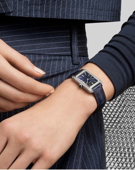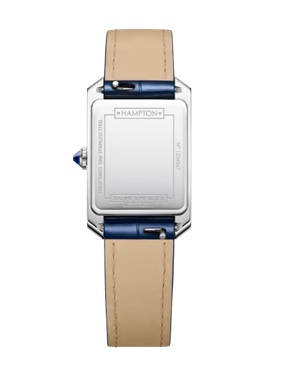 ダイヤモンドをセッティングした長方形のスティール製レディスタイムピース、ハンプトン10709は、クォーツムーブメントにシャイニーブルーのアリゲーターストラップを備えています。繊細で女性的、そして優雅なタイムピースです。