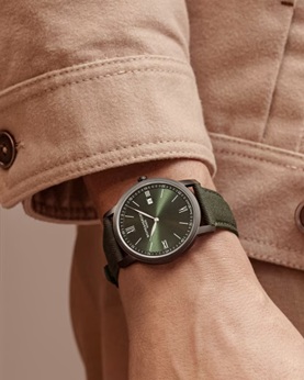 5年間の信頼性を誇るクォーツムーブメントを搭載したこのウォッチと共に、冒険の旅に出かけましょう。ADLC加工を施したサンドブラスト仕上げの42mmステンレススティール製ケースに収められたグリーンオパリンダイヤルは、堅牢なエレガンスを醸し出しています。ホーランド&シェリー社製のインターチェンジャブルなグリーンファブリックストラップと組み合わせれば、ストラップの交換が簡単な高い信頼性を誇るラグシステムにより、どのような旅にも対応できます。