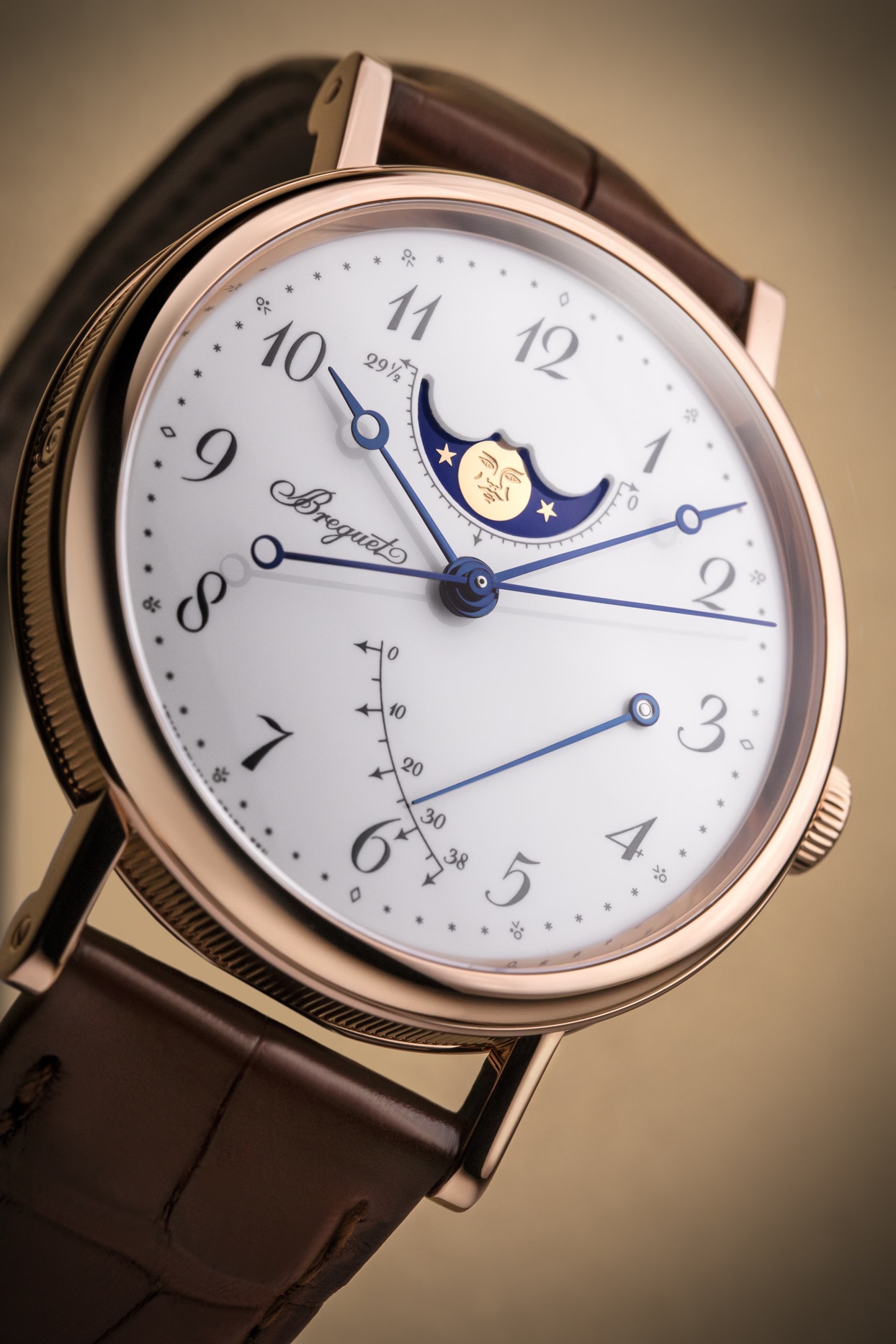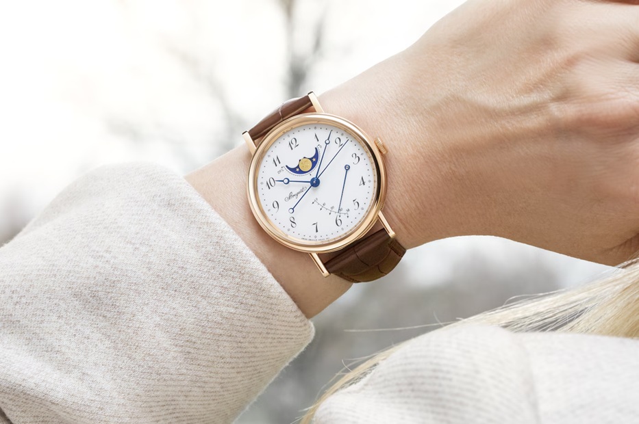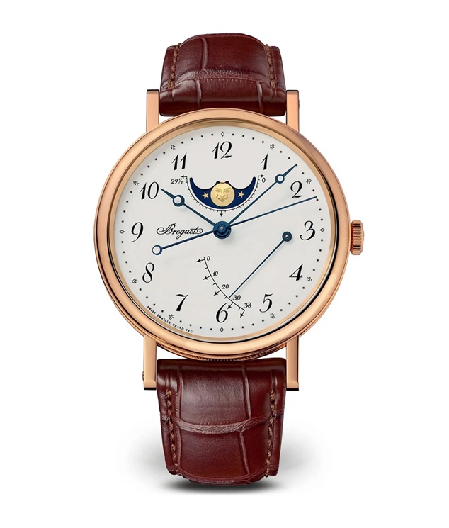 中央に時、分、秒表示を備えたこのモデルもまた、12時位置にムーンフェイズと、3時位置にパワーリザーブという2つの複雑機構を搭載しています。この表示は極めて視認性に優れた細長いエレガントなブレゲ針で読み取ります。