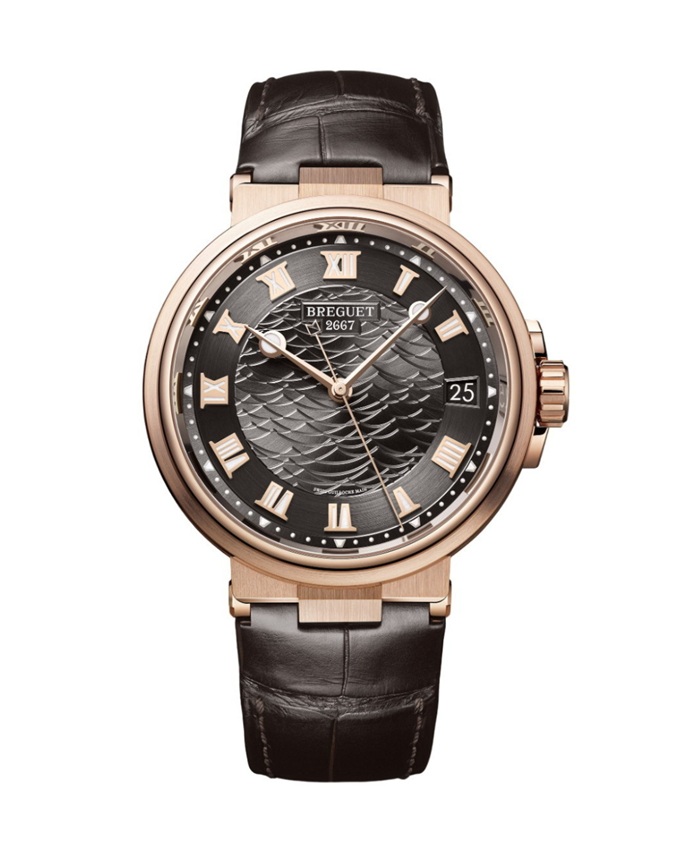 秒針にはブレゲのイニシャルをあしらった海洋信号旗のモチーフをはじめ、「マリーン」コレクションのエスプリを想起するディテールが随所に見られます。40mmケースのリュウズの周囲には波の模様を施しています。サファイア・ケースバック(透明裏蓋)からは自動巻き機構が見え、舵を彷彿とさせるローターを見ることができます。