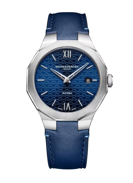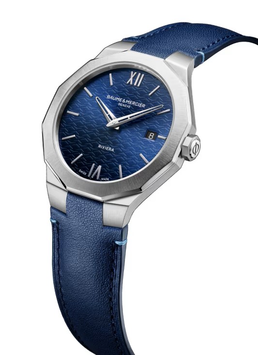 リビエラ 10846 39mmは、ビスのない12角形のポリッシュ/サテン仕上げを施したスティール製ケースが特徴で、反射防止サファイアクリスタルで保護されています。 ウェーブ模様が施されたサンバースト仕上げのサテンブルーダイヤルは、ロジウム加工のリベットで留めたインデックスとローマ数字を際立たせています。 クォーツムーブメント(ETA F06.115)を搭載し、電池寿命5年、防水性能5 ATMを備えています。ダークブルーカーフスキン製ストラップは、信頼性の高いインターチェンジャブルシステムにより、特別なツールを必要とせず簡単にご自身で交換することができます。