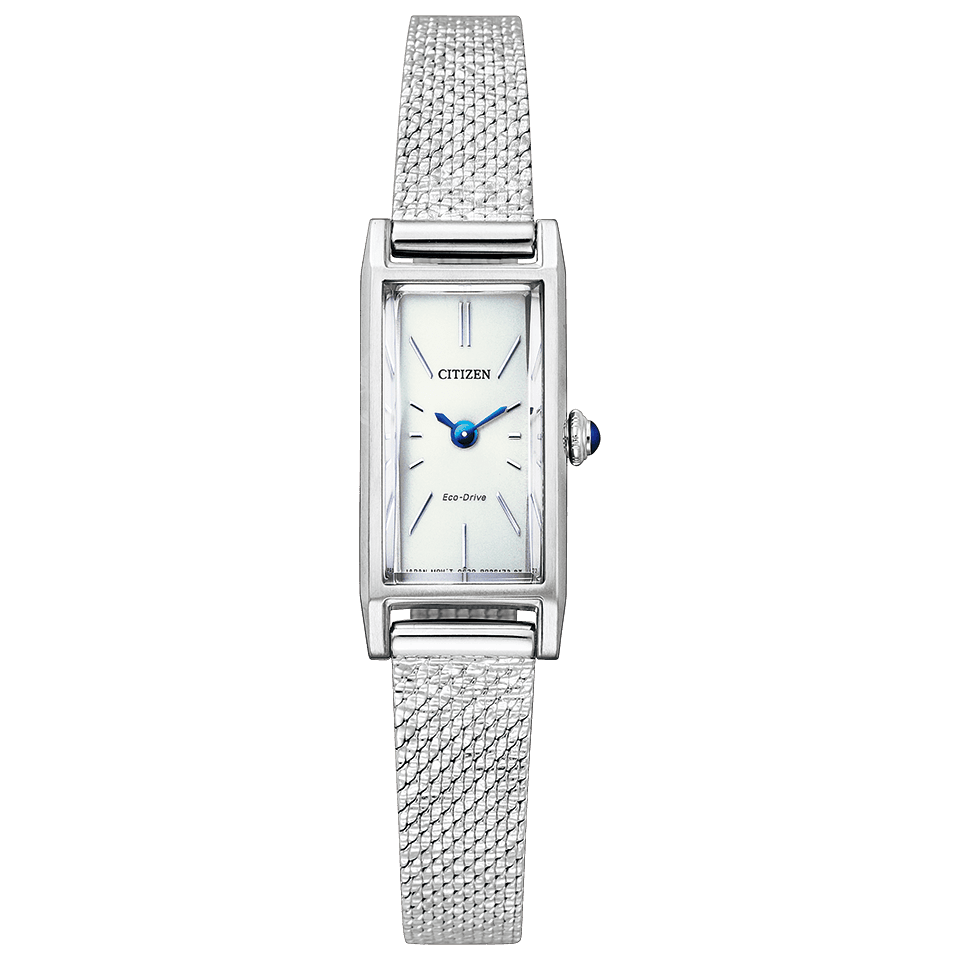 ハンサムな印象の長角ケースにカーブガラスを合わせた、オーセンティックなデザイン。文字板はすっきりとした印象のバーインデックスを採用し、小さめサイズながらも見やすさにこだわりました。メッシュバンドには、クラシカルな雰囲気をより一層高める風合いのあるパターンを施しました。