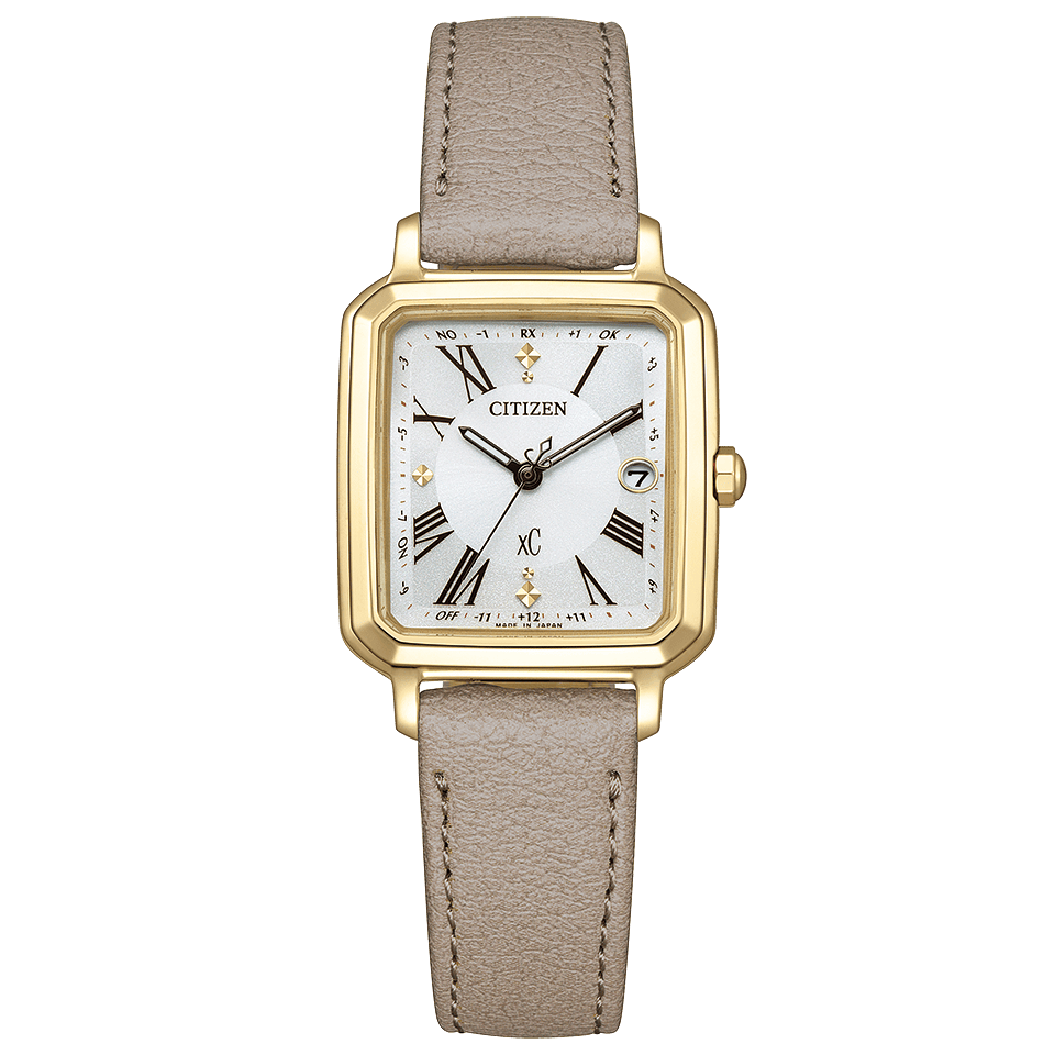 優しくフェミニンなクロスシーらしいケースライン。軽く、薄く、大きすぎないサイズ感で、スクエアを柔らかな印象へ導きます。インデックスは、伸びやかなローマ数字をラウンドに配置しつつ、12時、6時、9時の輝くカットパーツはhikariコレクションの特長です。シーンに合わせて印象が変えられる付け替えバンドがセットされているので、ご自身で付け外しができるインターチェンジャブル構造を採用。