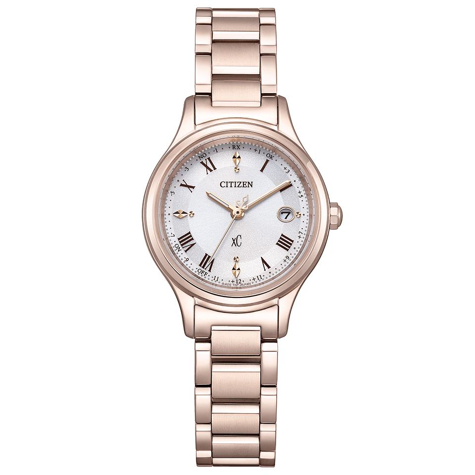 hikariコレクションのデザインポイントである”光の環”をイメージした、すっきり細く上品なベゼル。艶やかなパールホワイトの文字板、ブラウンのローマ数字インデックスが、視認性を確保しつつ上品で優しい印象を与えます。文字板12時、6時、9時位置には、差し込む光をイメージして、ひし形と丸型2種のカットパーツをセッティング。ガラスには、持ち主の幸せを願い、お守りとなるよう想いを込めた“光の粒”=ミルグレインリングを、ガラスにレーザー加工で表現しました。集めた光を放つかのように、シンプルながらも、動くたびにキラっと輝く美しいデザインです。肌なじみの良いサクラピンクのバンドには、ご自身が簡単に長さを調節できるシンプルアジャストを採用しています。