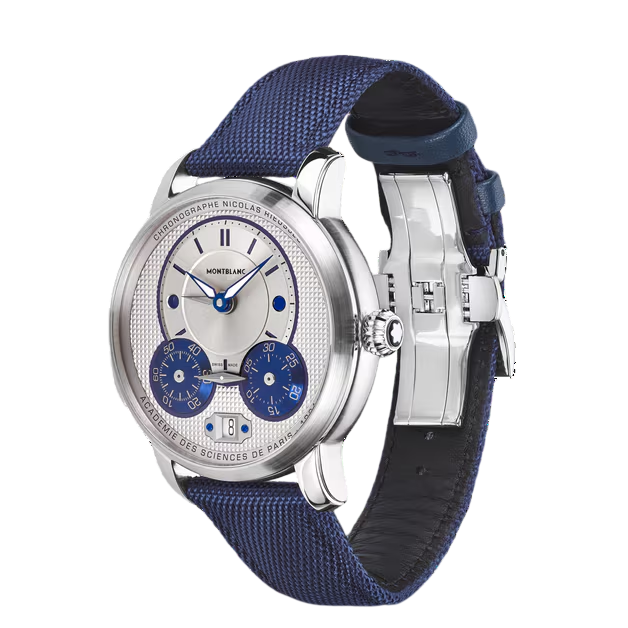 ブルーインデックスとクロノグラフ カウンターを備えたシルバーホワイトカラーの「クル・ド・パリ」のダイヤル