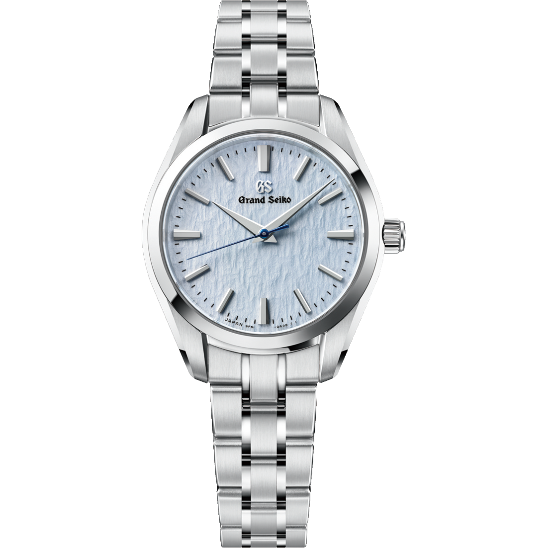 グランドセイコーのクオーツモデルの製造地であるセイコーエプソン塩尻事業所内「信州 時の匠工房」から望むことができる穂高連峰では、冬の時期になると未踏の雪原に風が刻む風雪紋を目にすることがあります。その耽美な風景に、空の色が反射した景色を写し取った「雪白ブルー」ダイヤルをあしらった、ケース径33mmの小ぶりなモデルが登場。雪と空の美しさと儚さが、匠の技によって繊細に作りこまれています。