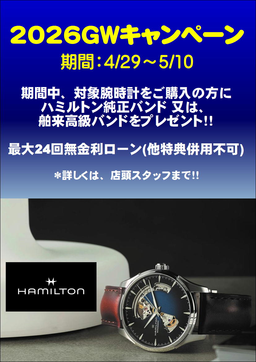 ハミルトンは、常時120本という西日本最大級の売場でもあり、専用レザーバンドやステンレスバンドなどのパーツも販売しており、アフターサービスも充実しております。
