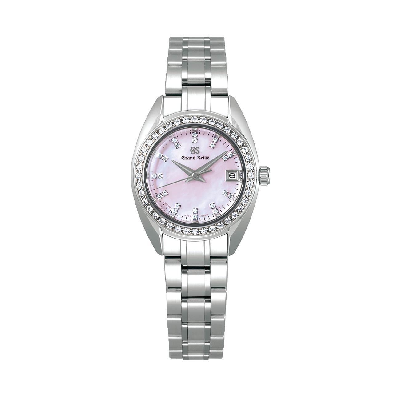 グランドセイコーのクオーツ時計の製造拠点でもある長野県が、全国一の生産量を誇る花「芍薬」をデザインモチーフにした、ケース幅26mmの小ぶりなサイズのクオーツモデルです。40個のダイヤモンドがセッティングされたケースと、上品なピンクの白蝶貝ダイヤルが大輪で高貴な美しさを漂わせる芍薬を想起させます。またダイヤカットを施した針やインデックスの煌めきは、美しさと視認性を共存させたデザインで、どんな装いにも合わせやすく、エレガントな時を演出してくれます。