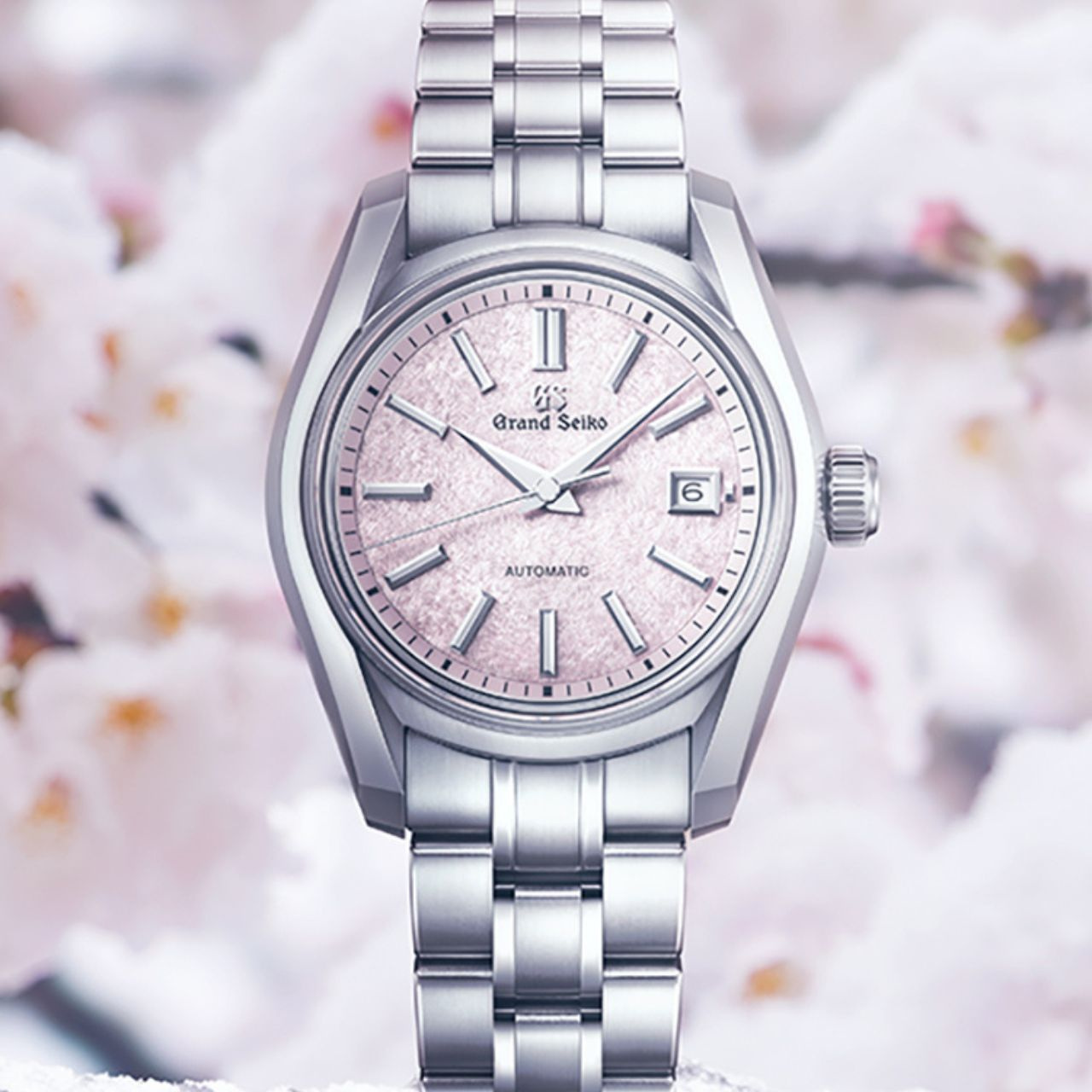 ダイヤルは、桜の花を雪が覆い隠す「桜隠し」の情景から着想を得ています。この幻想的な風景は、グランドセイコーのメカニカルモデルを製造する「グランドセイコースタジオ 雫石」が位置する東北地方で、春の訪れとともに見られるものです。雪と桜が共存する儚く美しい春の瞬間を、繊細な型打ち模様とグレイッシュなピンクカラーで表現。