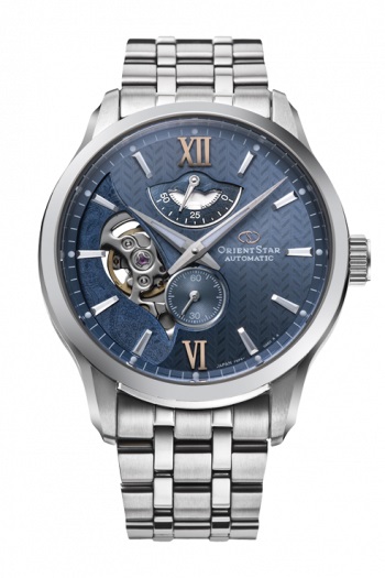 文字板の上部には綾模様の美しいヘリンボーン柄を、下部には光沢感ある裏地をイメージしたペイズリー柄をあしらい、ジャケットに用いられる表裏の異なる表情を演出しています。また、セミスケルトンの開口部をペイズリーの形状にすることで、機械式ムーブメントの露出部分が一段と広がり、奥行感のある華やかでお洒落な印象を与えてくれます。爽やかなブルーと微妙に色調を変えたスモーキーなライトブルーがレイヤーを強調し、メタリックな質感の文字板に精彩をもたらします。スーツからカジュアルまで、さまざまなシーンに映えるスタイリッシュなモデルです。