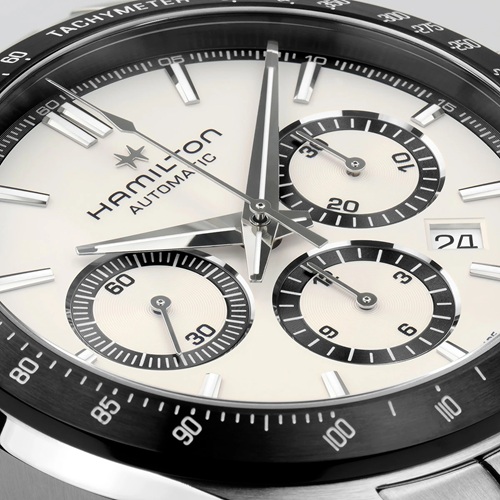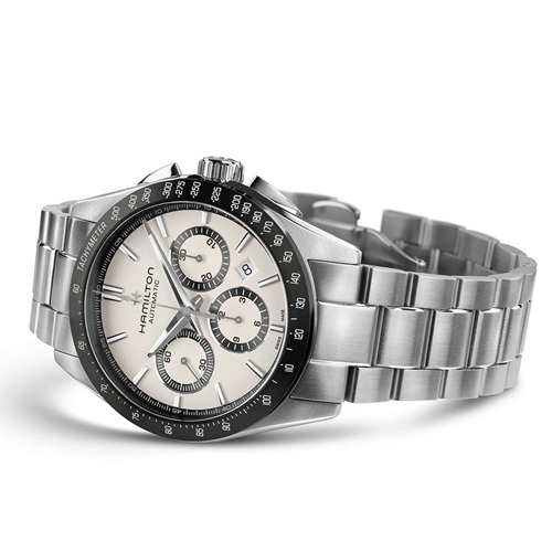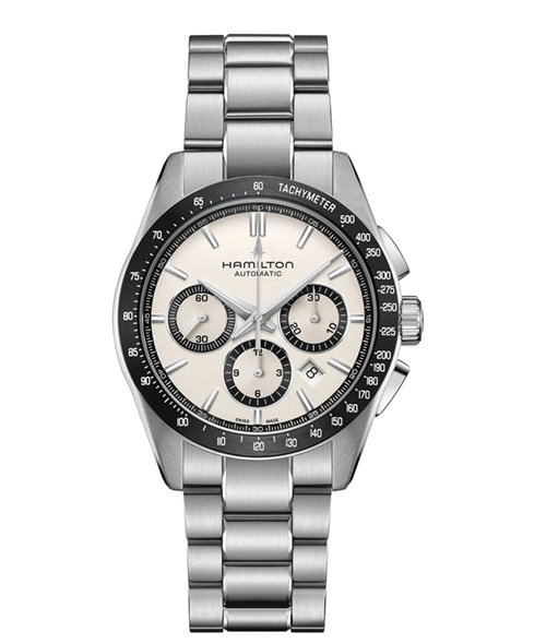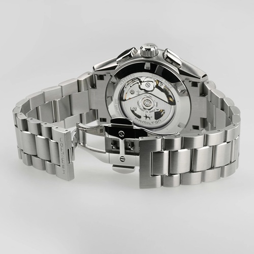 標準持続時間60時間のH-31自動巻きクロノグラフムーブメントが駆動する「ジャズマスター パフォーマー オートクロノ」は、42mmのステンレススチール製ケースに、洗練されたブラックダイヤル、存在感のあるステンレススチール製ブレスレットが組み合わされています。
