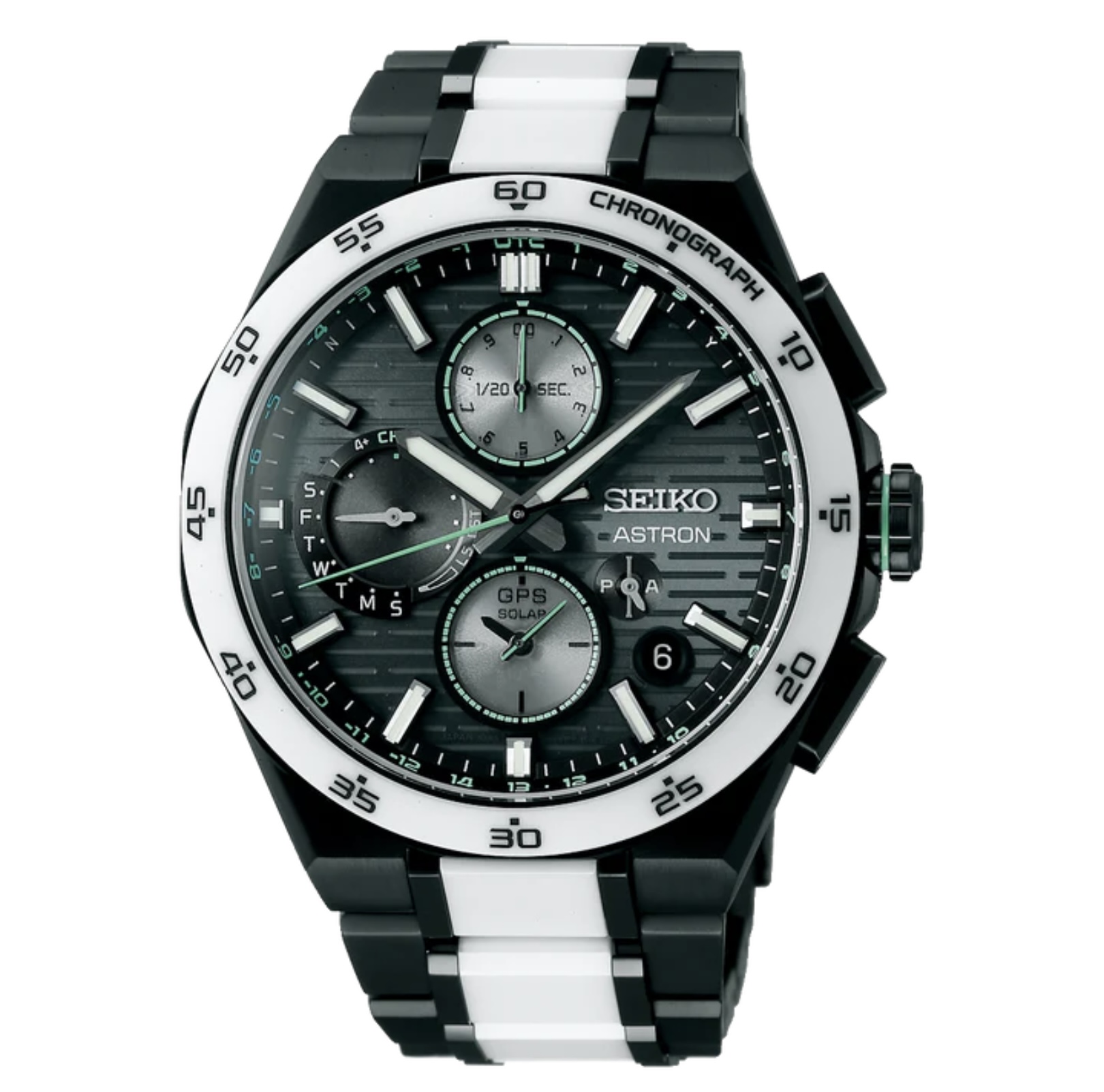 オールブラックカラーのケースにホワイトセラミックスを合わせることで、異素材の融合を際立たせたデザインが特徴