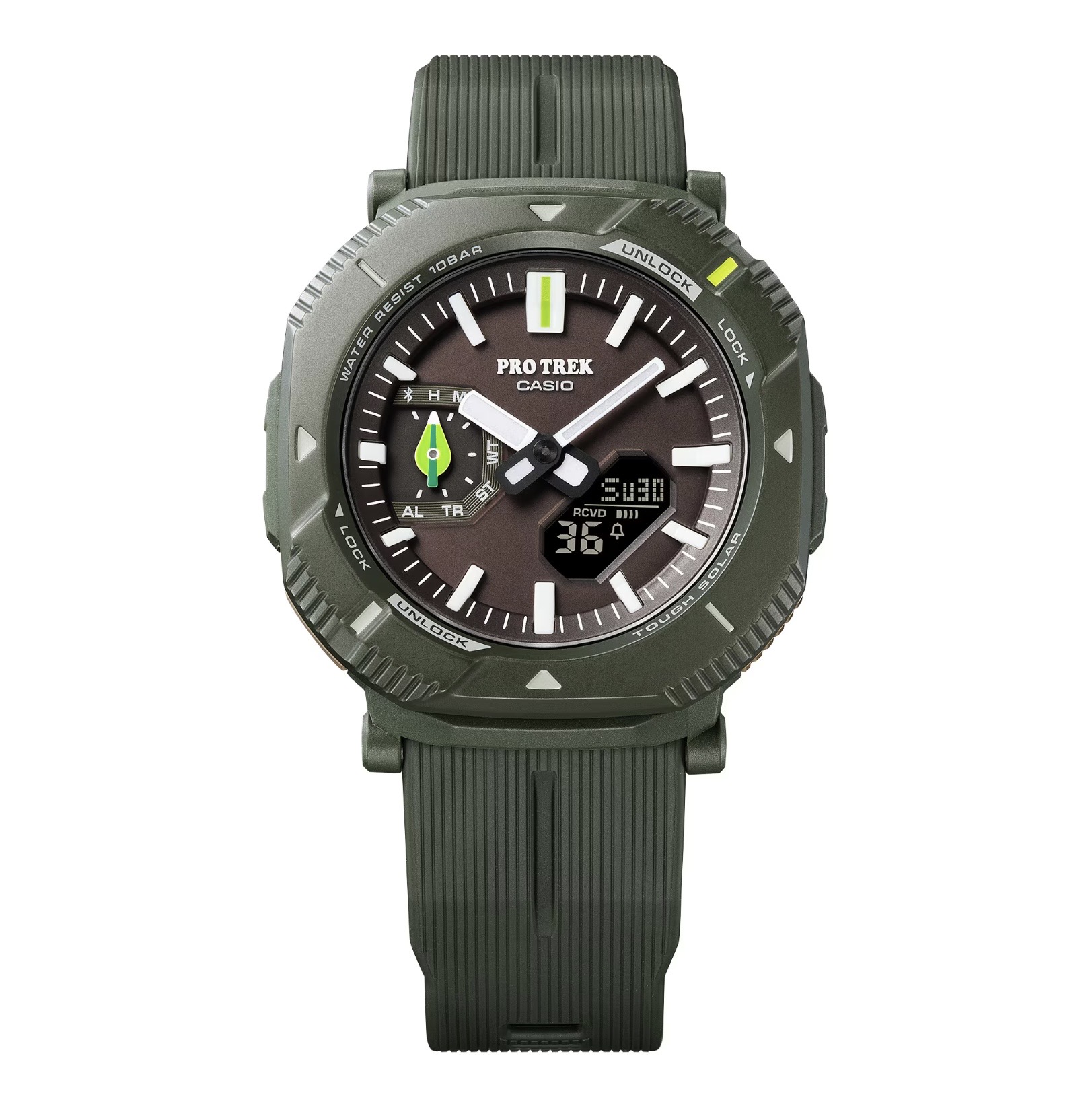 安全祈願として蓄光練り込み樹脂インデックスを採用し暗所での視認性を向上。ケース、バンド等にはバイオマスプラスチックを使用し環境へも配慮しました。