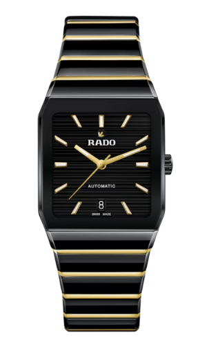 1983年のデビュー以来、Rado Anatomは画期的なデザインと究極の快適さのシンボルとなってきました。特徴的なのは、メタライゼーション処理されたシリンダー状のサファイヤクリスタルで、両面でエッジが面取りされ、ハイテクセラミック製ブレスレットの中までシームレスに伸びており、ケースとブレスレットが一体感のあるまとまった形をなして、滑らかで連続的なフォルムを作り出しています。ポリッシュ仕上げブラック ハイテクセラミック製リンクとポリッシュ仕上げイエローゴールドカラーPVDコーティングが施されたステンレススチール製中央リンクから作られたブレスレットは、艶消し仕上げステンレススチール製3つ折れ式バックルで入念に固定されています。 この独特のクリスタルの下にはブラックラッカー塗装のダイアルがあり、不規則な間隔で水平方向のラインが織りなす印象的な模様をあらわにしています。ホワイトSuper-LumiNova®がコーティングされたイエローゴールドカラーの針とアプライドインデックスが、ダイアルの深みに対して洗練されたコントラストを生み出しています。ダイアルを飾って、12時位置にはアイコニックな動く錨のシンボルが配され、6時位置の控えめな日付表示によって引き立てられています。 心臓部では、21石の自動巻キャリバーR766が鼓動していて、サファイアクリスタルのケースバックを通してその眺めを楽しむことができます。5つのポジションで精密に調整され、Nivachron™(ニバクロン)ひげぜんまいを搭載したこのムーブメントは、高い精度レベルと72時間のパワーリザーブを実現し、完璧さを追求するラドーのこだわりを証明しています。