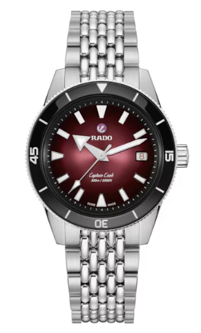 1962年のオリジナルモデルにインスパイアされたこの魅惑的なキャプテンクックは、ボックス型サファイアクリスタルの下で光を受けて輝く、ブラックからバーガンディへと移ろうグラデーションダイヤルを特徴とします。ロジウムカラーのインデックスと針にはSuper-LumiNovaが施され、ラドーを象徴するポリッシュ仕上げのハイテクセラミック製ブラックベゼルインサートが、タイムピースに力強い存在感を添えています。内部には25石の3針自動巻きムーブメントであるラドーキャリバーR763を搭載。耐磁性に優れたNivachron製ヒゲゼンマイを採用し、高い信頼性と高精度を実現しています。ケース径39mmのステンレススチール製ケースは、既存の37mmと42mmに加わる新しいサイズとして、あらゆる手首に心地よくフィット。防水性能は30気圧(300m)を誇り、シリーズの魅力をいっそう広げます。この時計は、ヴィンテージスタイルのライスグレイン・ステンレススチールブレスレットをはじめ、バーガンディにブラックの縁取りを施したNATOスタイルのテキスタイルストラップ、そしてブラックレザーストラップの3本が付属。シーンや気分に合わせて簡単に付け替えが可能です。豊かさと堅牢さ、そして揺るぎない信頼性――アクティブな冒険者の理想のパートナー、それがキャプテンクックです。