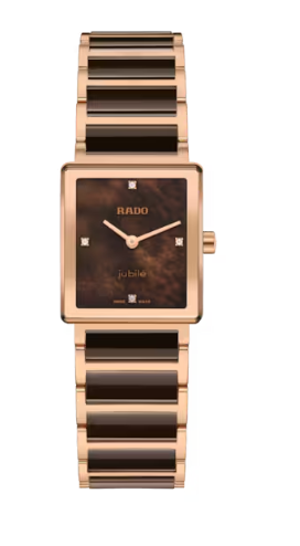 一目で心を奪うのは、4つのダイヤモンドをあしらったダイヤル、ローズゴールドのカラーリング、そしてハイテクセラミックリンク。インテグラルは、その伝統を受け継ぐタイムピースです。ダイヤルに視線を移すと、ブラウンのマザーオブパールが豊かな表情を見せ、並みはずれた美しさでそれでいて、目を引くもの。エレガントさを際立たせます。 ポリッシュ仕上げのローズゴールドPVDコーティングを施したステンレススチール製ケースには、ローズゴールドPVDと光沢のあるブラウンハイテクセラミックリンクを組み込んだブレスレットを組み合わせました。反射防止コーティングと面取り加工を施したカーブサファイアクリスタルにはローズゴールドカラーのメタライゼーションが施され、光を受けて輝くマザーオブパールの文字盤を美しく保護します。ラドーならではのミニマルデザインに、6石2針のスイス製R209クォーツムーブメントを搭載し、正確な時を刻みます。サファイアクリスタルとハイテクセラミックリンクが生む快適な装着感に加え、カーブガラスが手首のラインに沿ってブレスレットと自然に調和。アイコニックなインテグラルは、エレガントなマザーオブパールダイヤルによって、さらに優雅さを増しています。