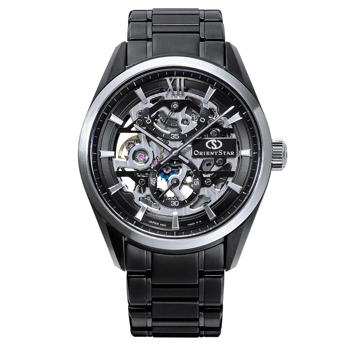 ローマ数字とインデックスを配したオープンワーク文字板はブラック・グレーグラデーション仕上げ。黒めっきのケースとバンドがスチール色のベゼルと対比し、デザインをさらに引き立てます。