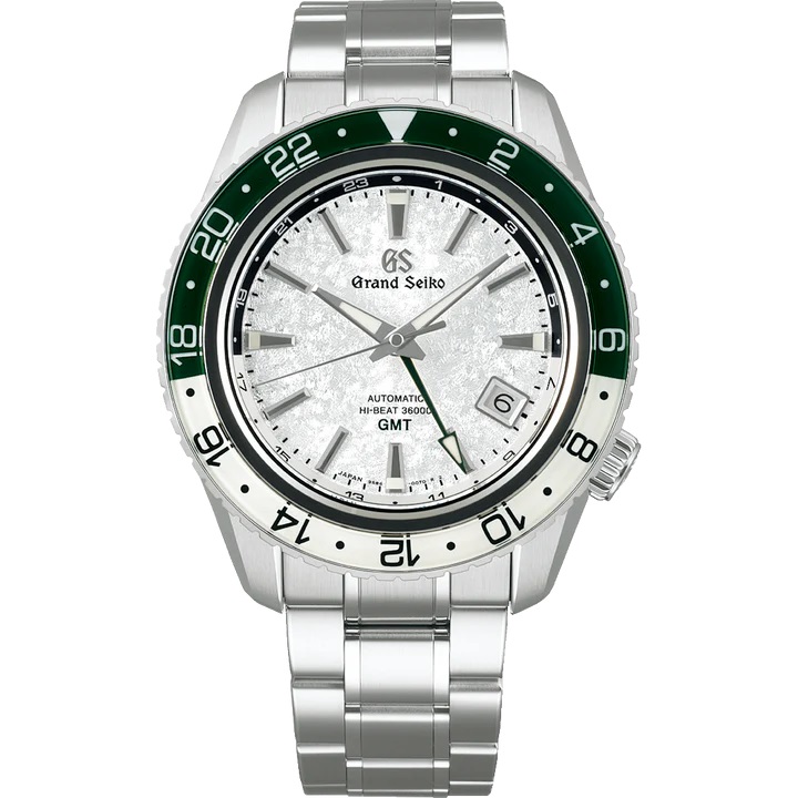 夏山の緑の中にくっきりと浮かび上がるその「雪渓」の雄大さを、回転ベゼルに施されたグリーンと、繊細な型打ちで表現された純白のダイヤルパターンで表現しました。