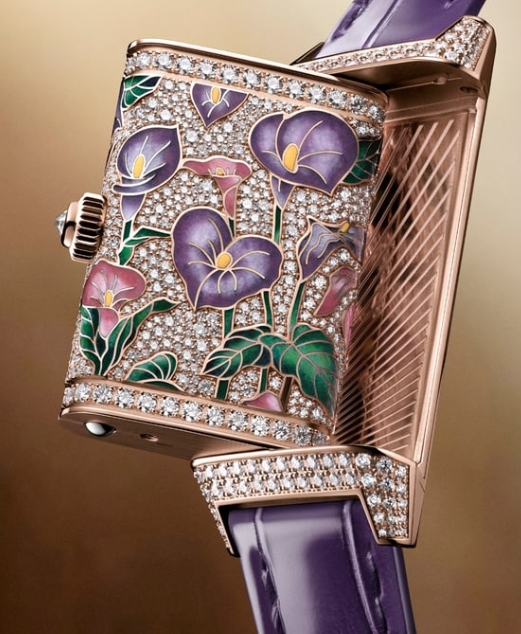 世界中の花々を主人公したタイムピースのコレクション、レベルソ・ワン・プレシャスフラワーの花園に新たに咲き競うのは、パープルカラーのアルムフラワー。ジャガー・ルクルトが紡ぐ卓越した時計製造技術とハイジュエリー技巧を融合したレベルソ・ワン・プレシャスフラワーは、メゾンの独創的で洗練された芸術的表現が華開く、夢の花園です。ダイヤモンドの輝きが包み込むこのジュエリーウォッチには、グラン・フーシャンルヴェ・エナメル装飾と2つのジェムセッティング技術、スノーセッティングとグレインセッティングが駆使されています。メゾンのメティエ・ラール™(匠の技)工房の熟練装飾職人たちは130時間にわたる緻密な作業を費やし、この楽園を彩りました。ダイヤル側面にエナメル装飾であしらわれたアルムフラワーが裏面で咲き競う花園へと誘い、タイムピースを反転すると絢爛と咲き誇るアルムフラワーが、スノーセッティングダイヤモンドの繊細な煌めきを背景にその精彩な姿を現します。雪のように敷き詰められた600石を超えるブリリアントカットのダイヤモンドは、メゾンの熟練ジェムセッターが卓出した忍耐力を持って石留めしています。