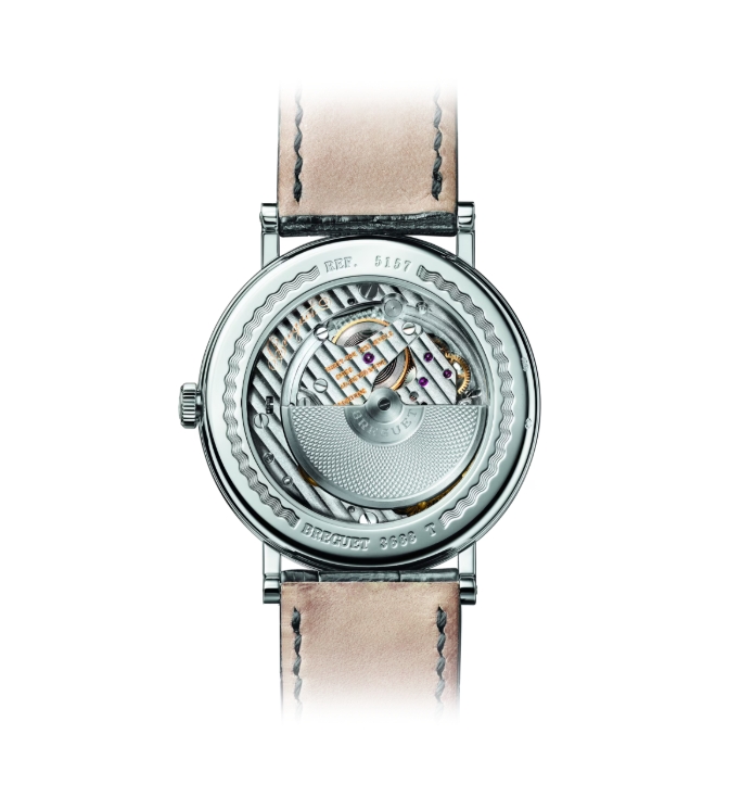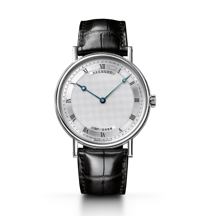 この直径38mmの極薄型モデルは厚さ5.5mmを誇ります。タイムレスなシンプルさを纏うケースはゴールドで製作され、サファイア・ケースバック(透明裏蓋)を備えます。クラシカルなフルート模様「コインエッジ」のケースバンド、そしてブレゲのイニシャルが刻まれたリュウズが特徴です。手彫りギヨシェ模様が施された文字盤は、ローマ数字をあしらったチャプターリング、ブルースティールの「アップルハンド」、シリアルナンバー、シークレット・サイン(11時と12時、12時と1時の間)があしらわれ、全体に落ち着いた雰囲気をもたらしています。