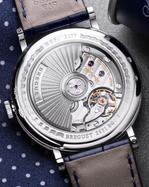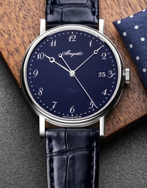 ブレゲの要素を色濃く受け継ぐこのモデルは、フルート模様「コインエッジ」のケースバンド、サファイア・ケースバック(透明裏蓋)、溶接されたラグ、「グラン・フー」エナメルダイヤルまたはギヨシェ模様の文字盤、極めて特徴的な「アップルハンド」のブレゲ針など、「クラシック」コレクションのモデルのあらゆる洗練された特徴をすべて備えています。