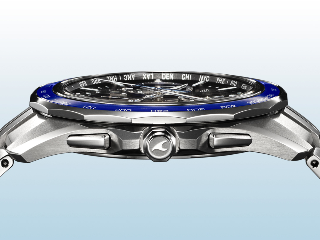 時計単体での時刻修正に加え、スマートフォンリンクによるワールドタイムの設定なども可能。これらの高機能を厚さ9.5mmのスリムケースに収めました。