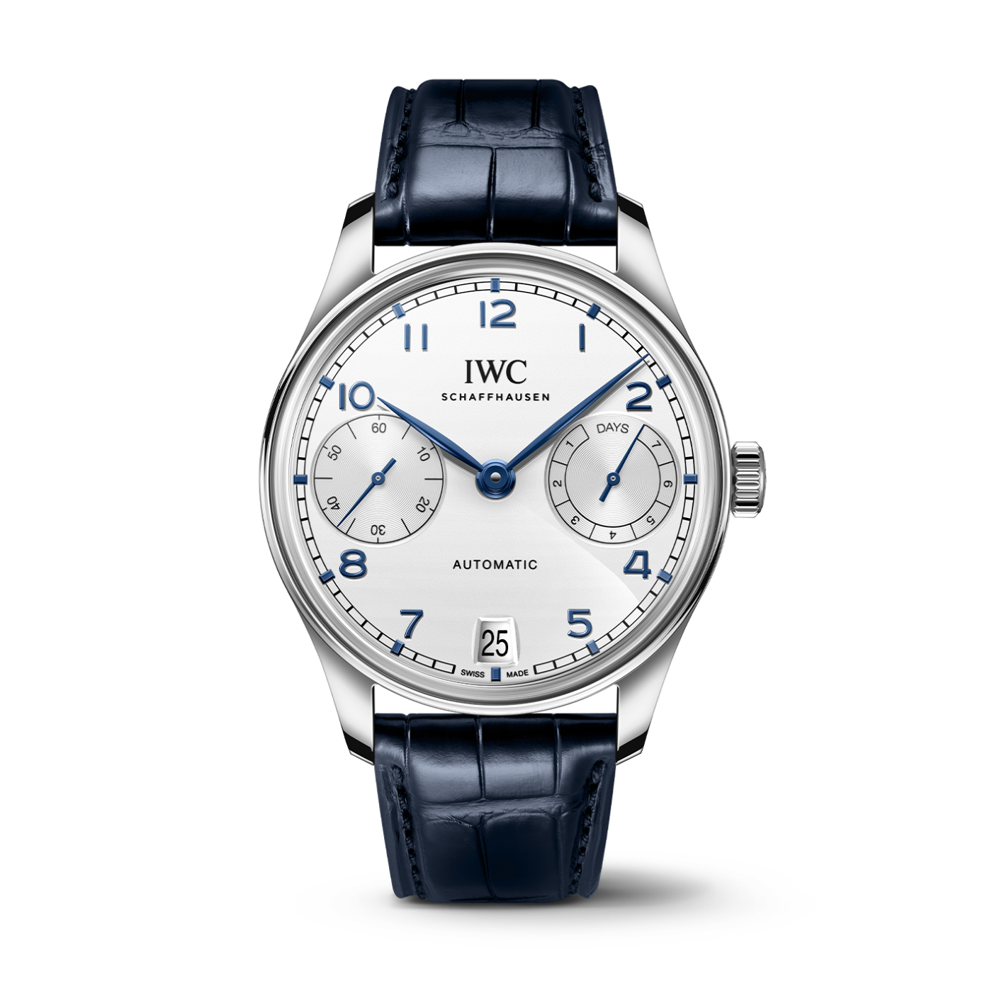 ステンレススティール製ケースの「ポルトギーゼ・オートマティック 42」。シルバーメッキの文字盤、ブルーの針とアップライト・インデックス、ブルーのアリゲーター・ストラップを備えています。
