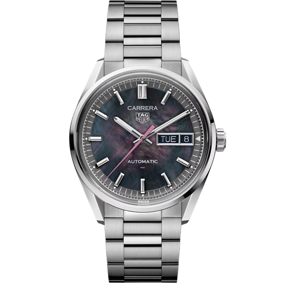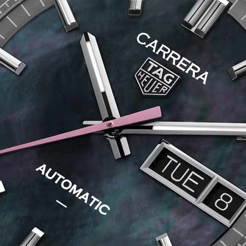 桜から着想を得た日本限定モデル タグ・ホイヤー カレラ デイデイト ジャパン リミテッドエディション。ブラックマザーオブパール(黒蝶貝) のダイヤルは光の加減や見る角度によって幻想的な輝きを放ち、ピンクの秒針をポイントとしてあしらっています。41mmと36mmの2サイズで展開している2つのモデルはペアウォッチとしてお使いいただくのもおすすめです。41mmモデルは200本のリミテッドエディションです。
