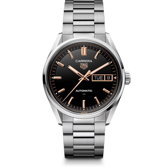 スタイルに洗練されたタッチを添える、タグ・ホイヤー カレラ デイデイト。サテン仕上げのステンレススティール製41mmケースを備えた洗練されたブラック オパーリン ダイヤルに、コントラストが映える18K 5N ローズゴールドプレートがアクセントを添えます。TH31-02 ムーブメントを搭載した、精度とエレガンスを体現するタイムピースです。