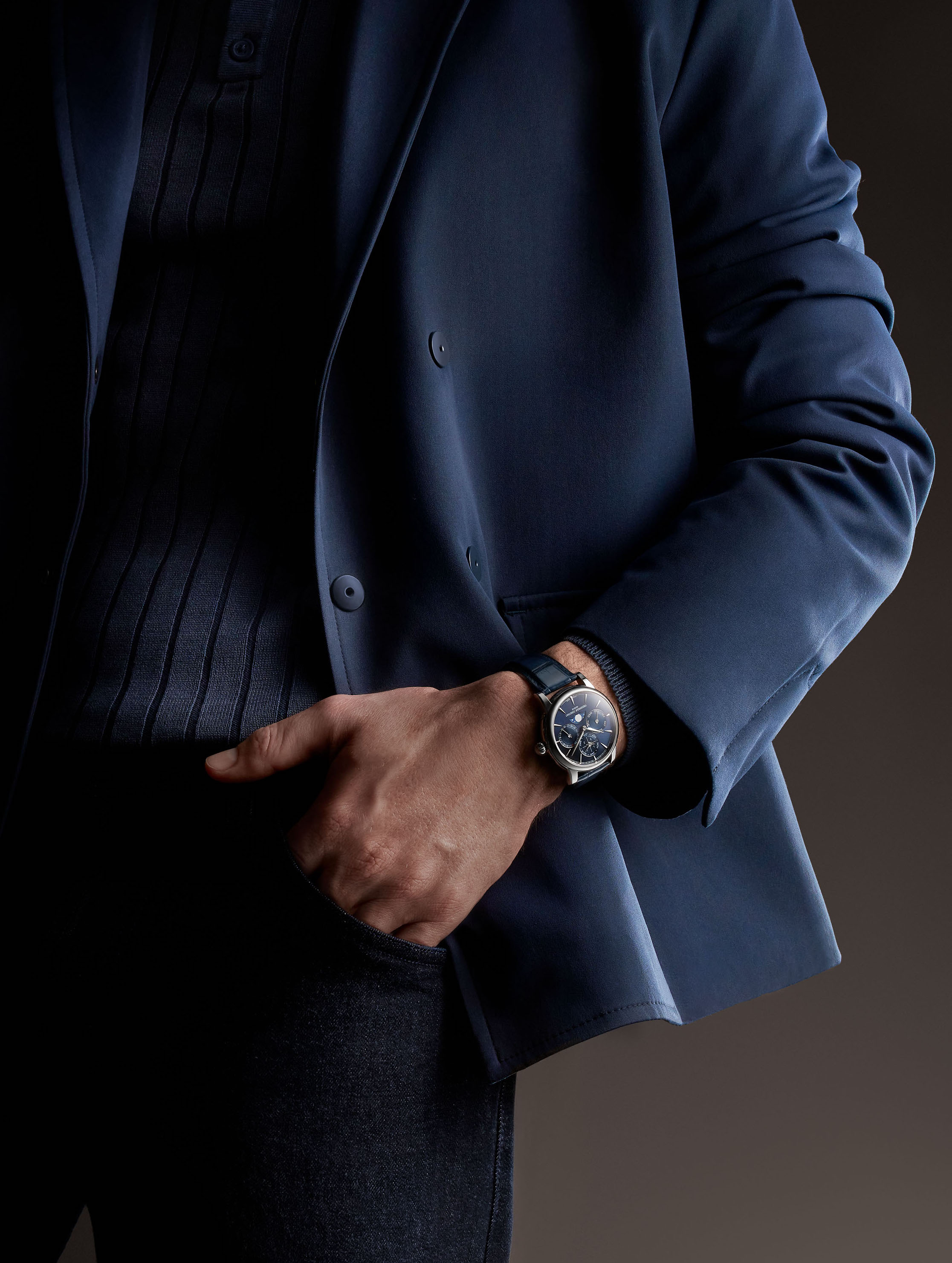 ネイビーの文字盤はシックかつ知的な印象を与え、大活躍すること間違いなし。