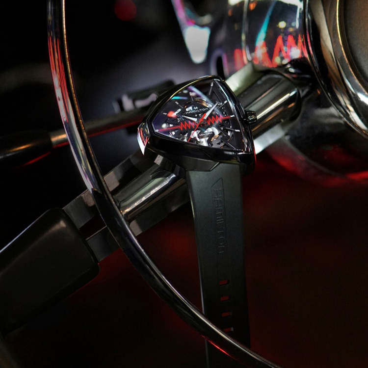 三角形デザインのベンチュラを80年代風にアレンジした人気シリーズ、エルヴィス80のスケルトンタイプが登場!エレクトリカルなイメージの大胆なカットアウト文字盤と、その中央を横断する赤いパルスが印象的。世界初の電池式腕時計の過去、現在、未来を讃えるトリビュートモデルです。ケースと一体化したようなアールを描くサファイアガラスといったこのシリーズならではのフォルムはそのままに、さらにコンテンポラリーなデザインに仕上がりました。ムーヴメントは80時間ロングパワーリザーブのH-10をスケルトン化したH-10-Sで、もちろん裏蓋もスケルトン。表と裏の両面から機械式の精緻な動きをお楽しみください。