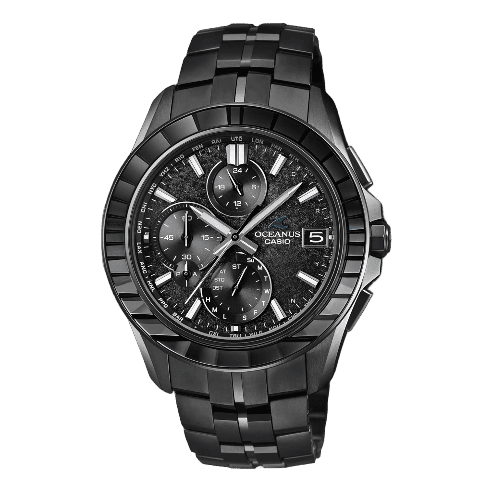 OCW-S7000CN-1Aは、OCEANUSが誇るものづくりの技術と日本の伝統技法が美しく融合したモデルです。上下で異なるカッティングラインが美しいサファイアガラスベゼルが特徴で、江戸切子の職人が一つひとつ手作業でカットを施して仕上げています。