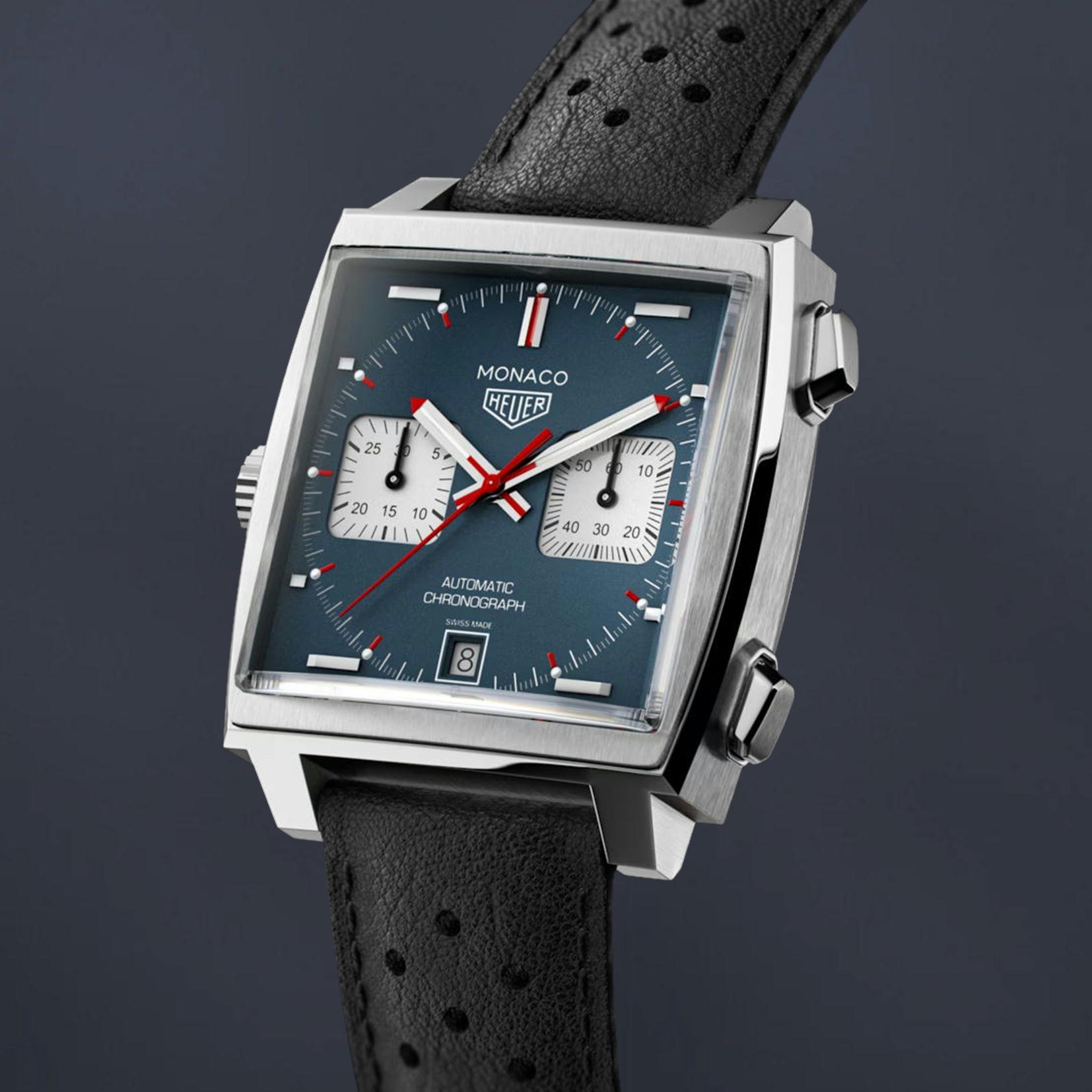 この自動巻クロノグラフ モナコ キャリバー11は、世界初のスクエア型ケースであり、同時に世界初の防水機能を備えたクロノグラフでした。 「キング・オブ・クール」の愛称を冠するスティーブ・マックイーンのアイコンともいえる革命的なキャリバー11 エディションは、左サイドにセットされたリューズが特徴的で、手で巻き上げる必要がないことを示唆しています。