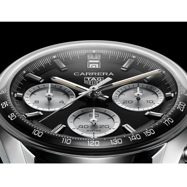 逆パンダ ダイヤルをもつ2447 NS モデルをベースにした、タグ・ホイヤー グラスボックスのプレステージなブラックの39mmモデル。カレラのシグネチャーデザインにモダンなひねりを加えています。ラグジュアリーなパンチング加工を施したカーフスキンストラップを合わせた、大胆に生きる人のためのウォッチです。