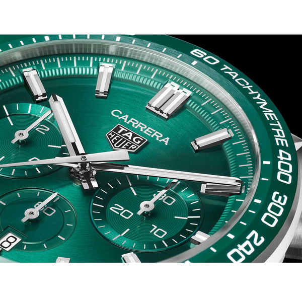 このクラシックなタグ・ホイヤー カレラ クロノグラフは、大胆なグリーンのダイヤルとマッチしたセラミック製ベゼルで、トレンドの魅力を演出しています。自社製ムーブメント、キャリバー ホイヤー02を搭載した冒険のためのタイムピースに、スポーティーなデザインとモノクロームなカラーが更なる魅力を添えています。
